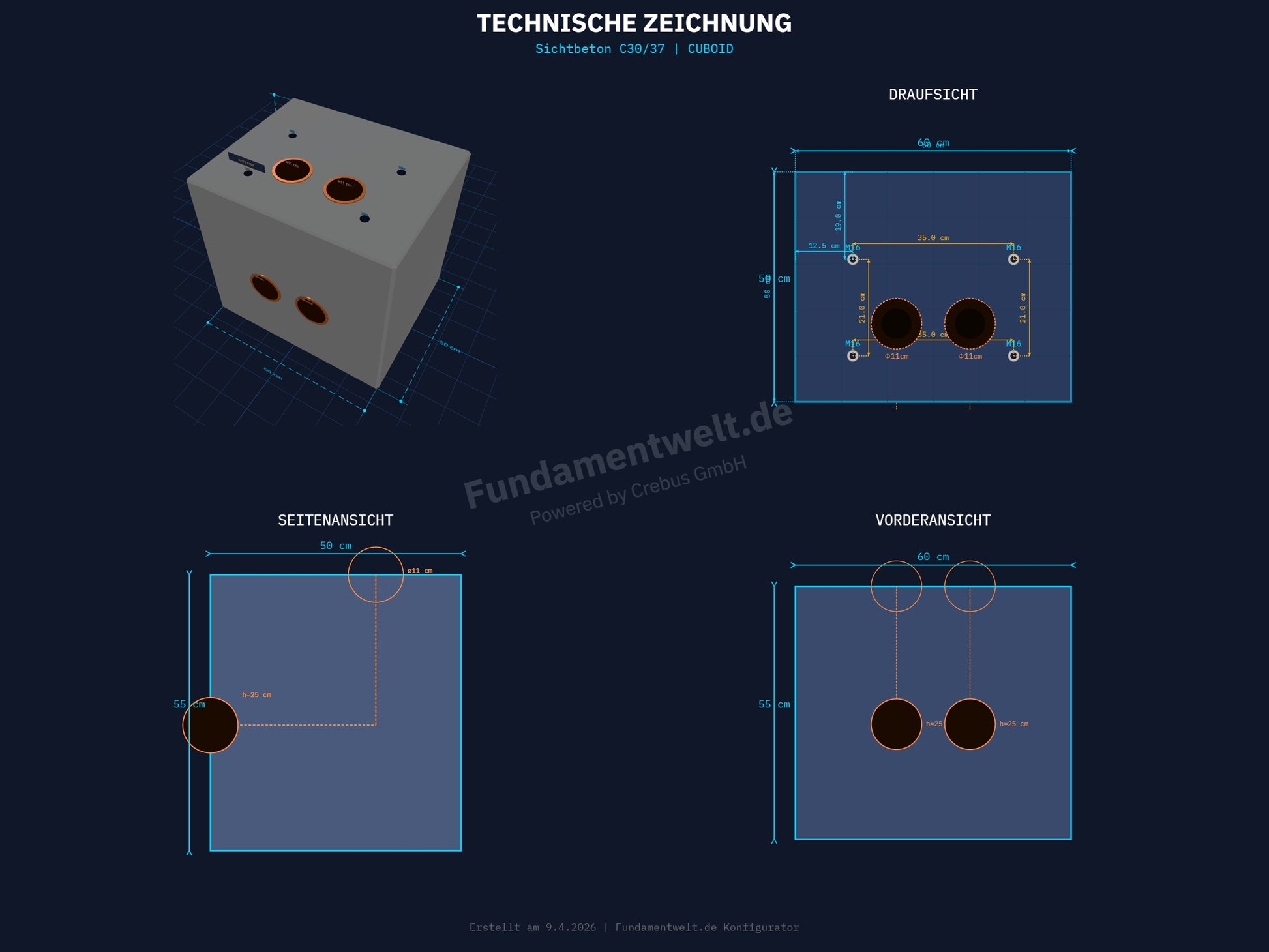 1x Fertigbetonfundament (Sichtbeton C30/37, Cuboid) passend für Delta DC Wallbox. Hinweis: Die Wallbox selbst sowie Befestigungsschrauben sind nicht im Lieferumfang enthalten.